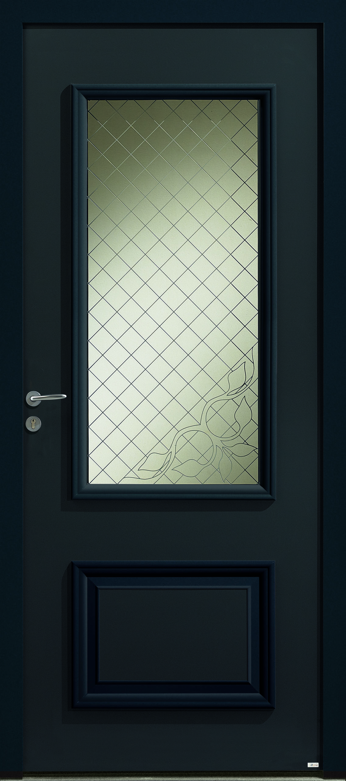 La porte d'entrée Médina est constituée d'une sérigraphie sophistiquée et quadrillée grise. Ses angles en bas de vitraux justifient ses qualificatifs.
