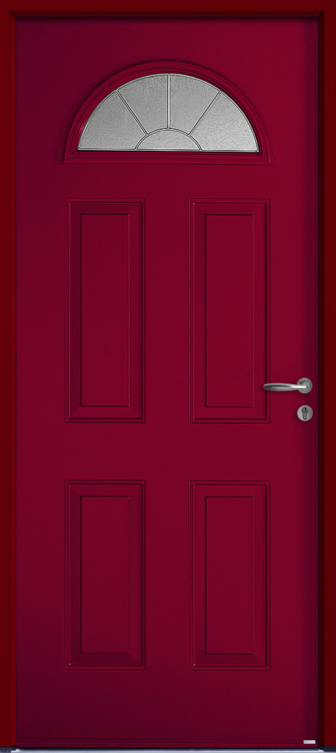 La porte d'entrée Victoria est composée de quatre inserts rectangulaires et d'un vitrail en arc de cercle sur la partie haute du vantail. Son semi-fixe est constitué d'un vitrage quadrillé sablé.