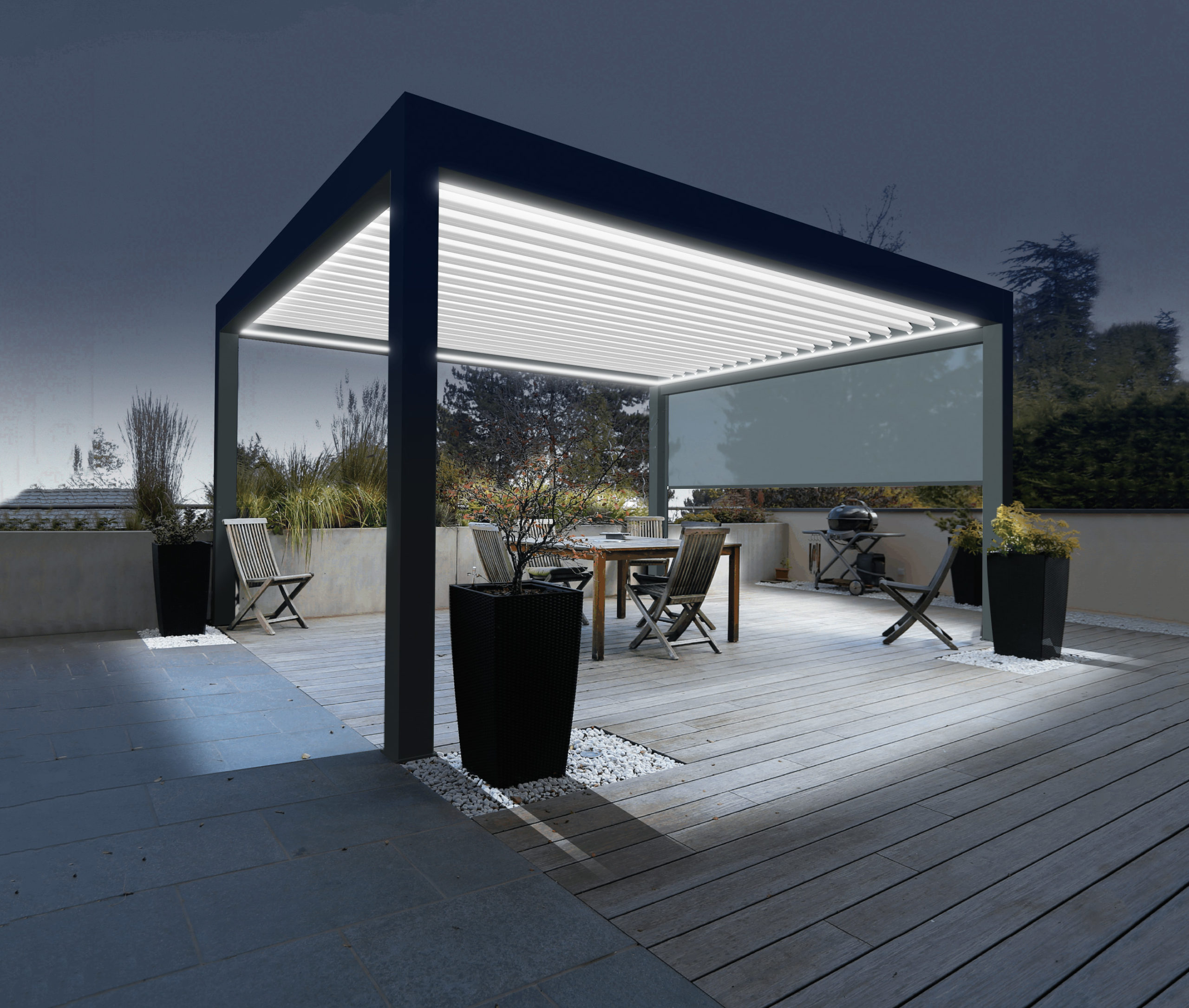 La pergola Suncontrol II est une pergola bioclimatique, c’est-à-dire que ses lames sont orientables afin de permettre un contrôle total du flux lumineux solaire.