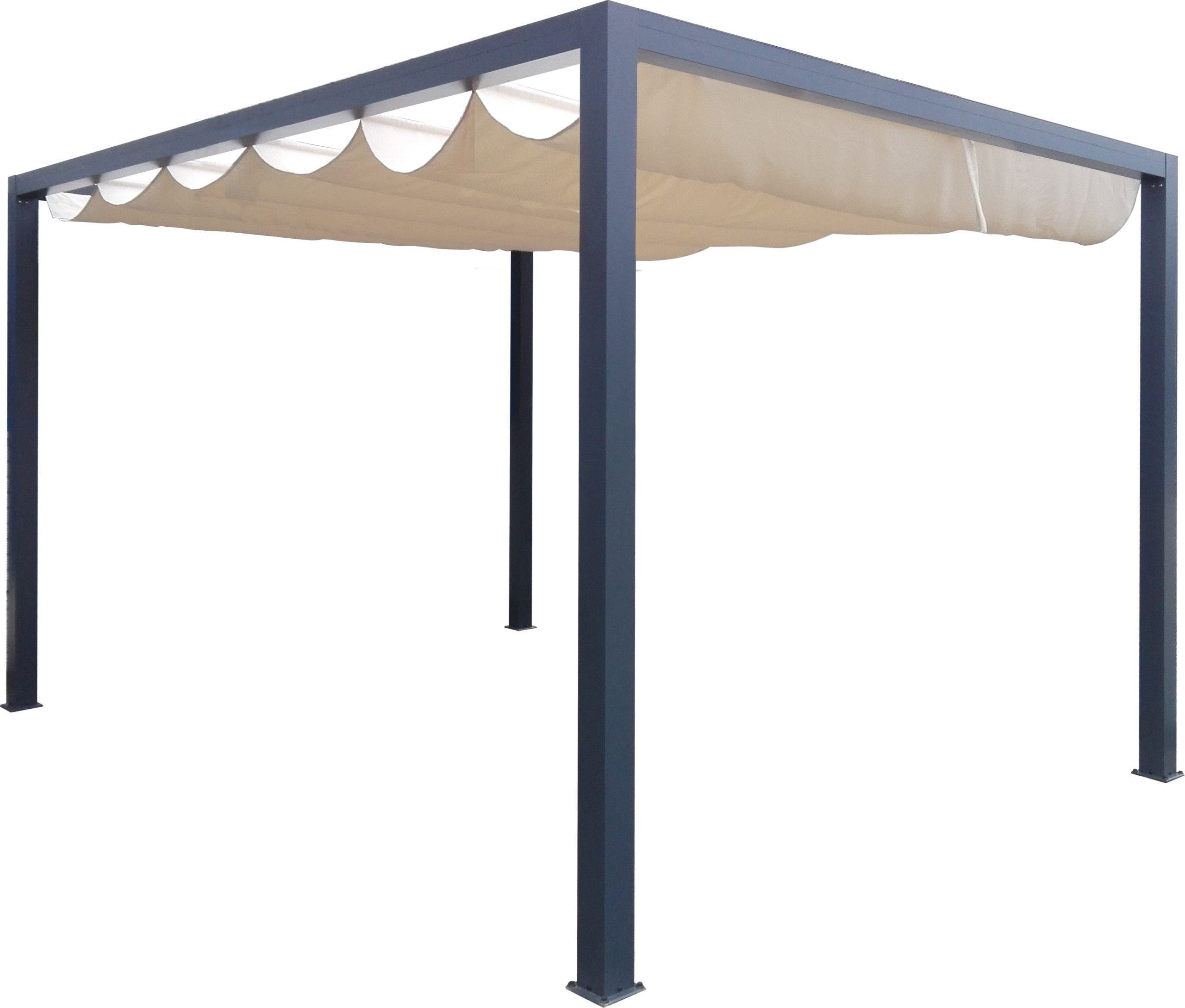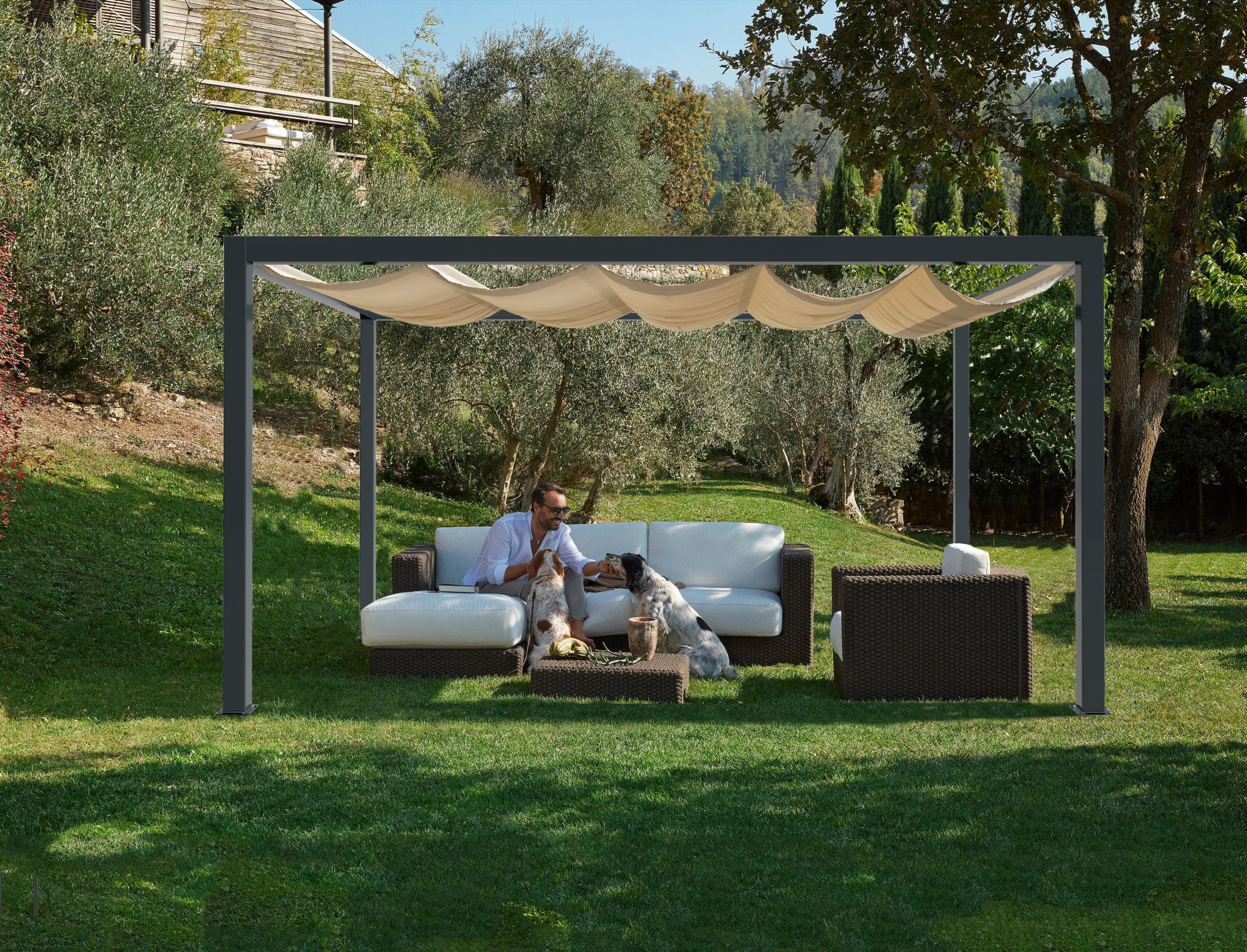 L'esthétique très sobre de la pergola permet d'embellir votre extérieur par la finesse du drapé et les lignes graphiques des poteaux et des traverses.