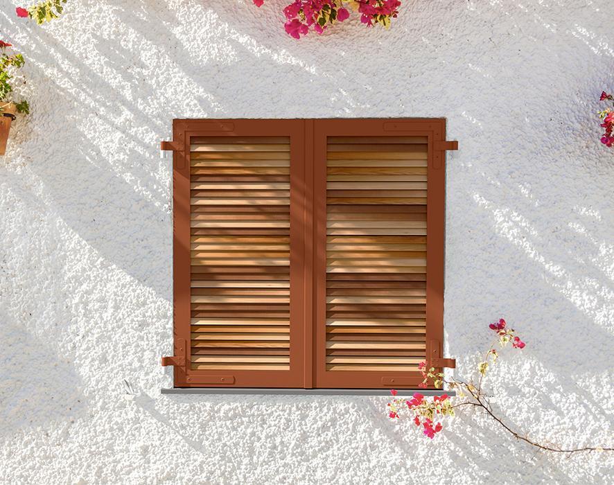 Le volet battant à cadre mixte en aluminium / bois est recouvert par du bois Red Cedar pouvant prendre 4 finitions saturateur de plus clair - naturel - au plus sombre - ébène en passant par du rouge basque et gris.