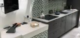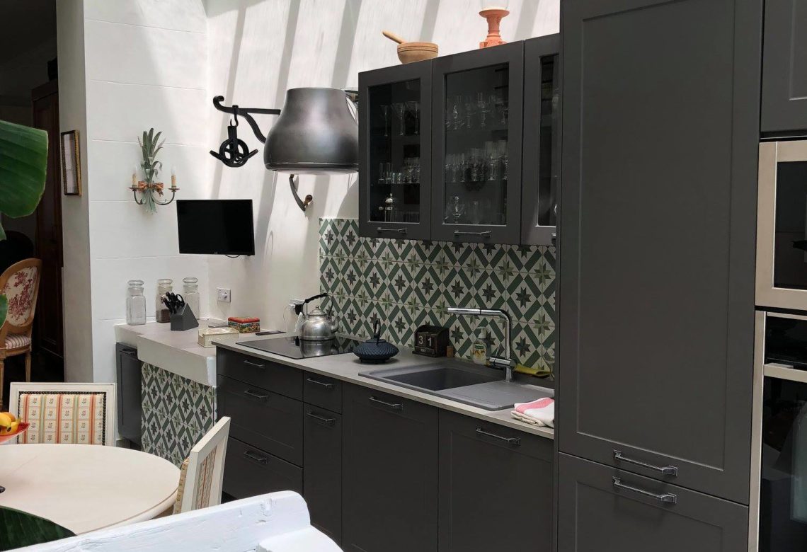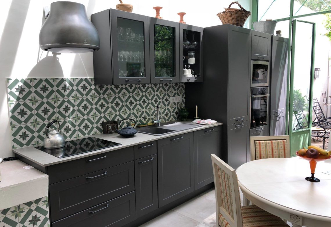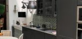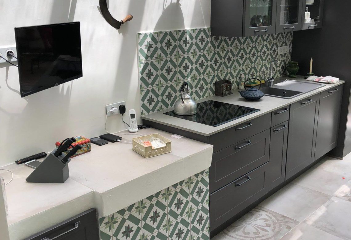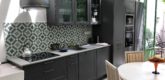 Réalisation d’une cuisine au coeur de marseille . Modele Iron de Zelig Laquée coloris ardoise. Poignée argent antique Plan de travail en céramique Basalt Black, évier et robinetterie franke, hotte helica