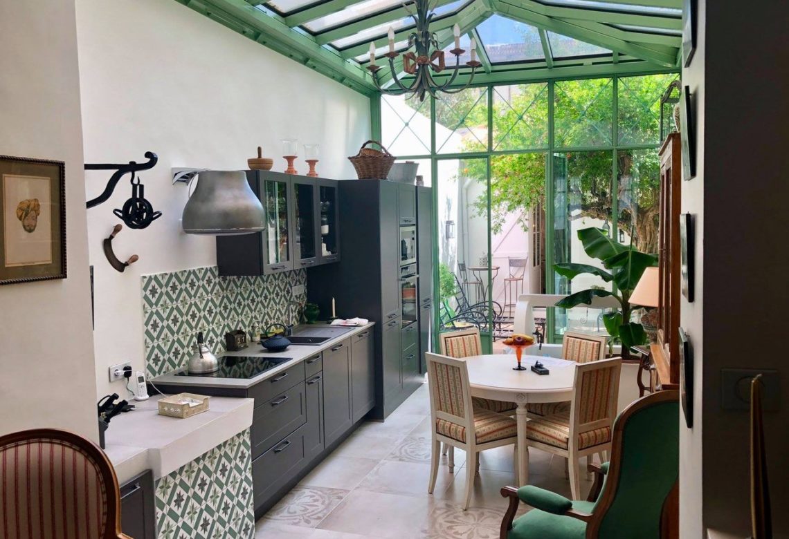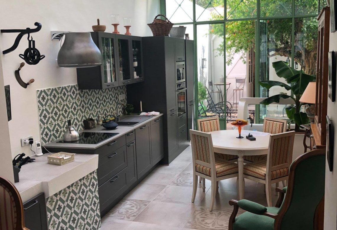 Le puits d’origine a été conservé et mis en valeur par des carreaux ciment . Magnifique verrière surplombant l’ensemble réalisé par Gaudin ferronnerie . Architecte Martine BESSON . Réalisation MENUISERIES ANTOINE