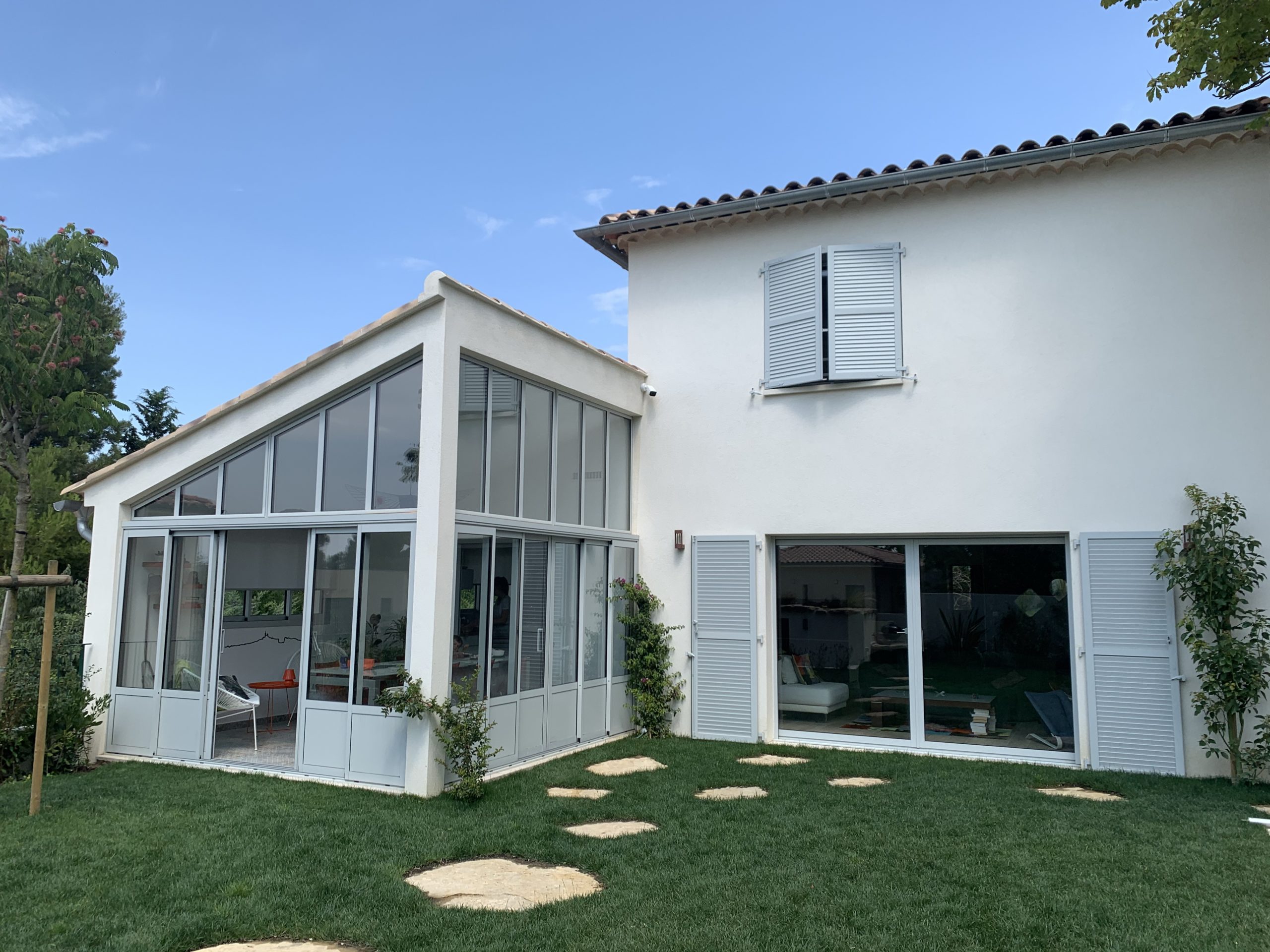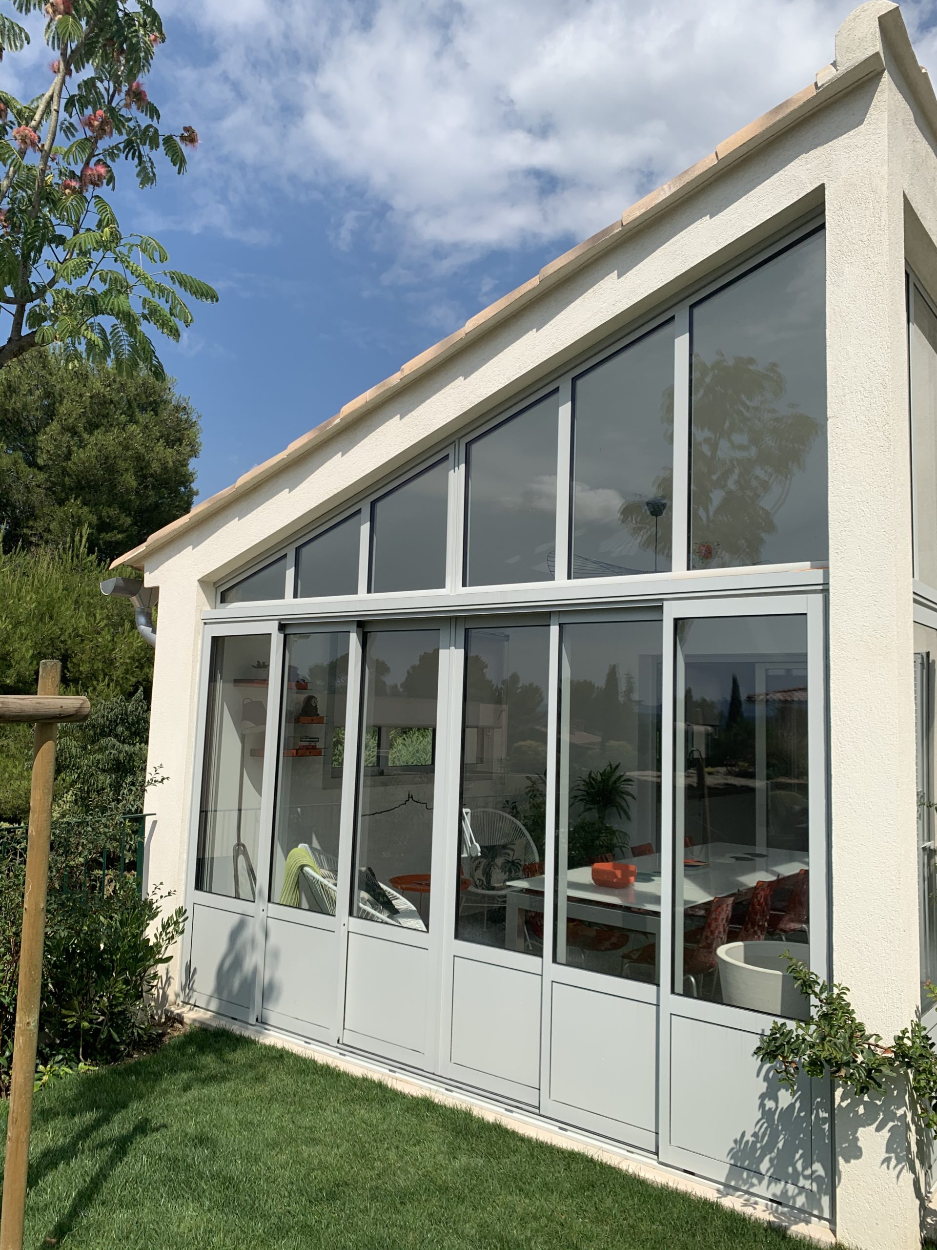 Création espace Véranda avec coulissants 6 vantaux et châssis fixes façon verrière.